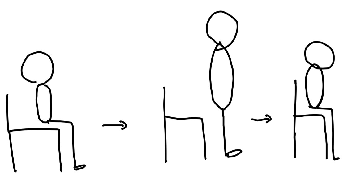 イスに座って→ 立ち上がり→ 足を閉じて座ります。これだけ。