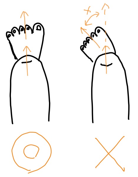 詳しくお伝えすると、母趾球(ボシキュウ)には力が入りますが、母趾球から先の指先まで均等に力は入らないはずです。